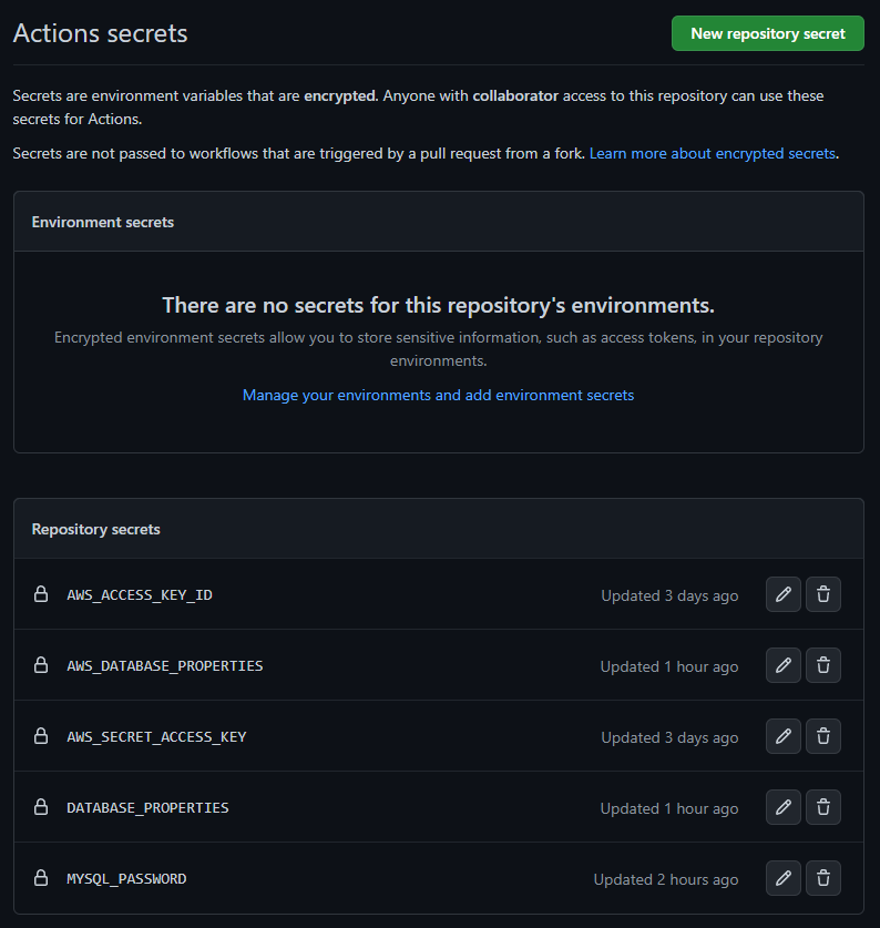 나는 여기서 DATABASE_PROPERTIES와 MYSQL_PASSWORD를 등록해주었다. 이 둘은 runner 위에서 돌아갈 mysql 서버에서 사용할 키값들이고, AWS_DATABASE_PROPERTIES는 AWS의 RDS DB 연동 정보이다. 비밀번호는 알아서 설정해주면 되고, properties 파일을 사용할 것이기 때문에 그 형식에 맞게 데이터를 넣어주면 된다.